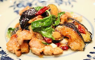 中国には、イタリアと品種は違うバジル(ホールバジル)を使った料理があります。今回は手に入りやすいスイートバジルを使用。なすを高温で揚げると、油っぽさを感じさせない仕上がりになります。一気に合わせだれをかけて全体をまとめるところが大事なので、調味料はあらかじめ合わせておくことがポイントです。