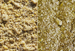 次にしょうゆづくりで大事なポイントになるこうじづくりについて説明しよう。ほぼ同じ量の大豆と小麦に、こうじ菌を加えるんだ。これを、こうじ菌の育ちやすい温度・湿度に保たれたこうじ室(むろ)と呼ばれる特別の部屋に置いて、こうじ菌を繁殖させるんだよ。