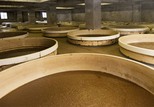 3つめの原料である食塩を水で溶かして、こうじとまぜ合わせ、仕込み蔵の大き