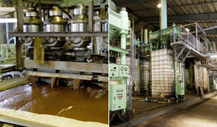 熟成が終わったら、今度はもろみからしょうゆをしぼりだす圧搾の作業だ。昔も今も、もろみは布に包まれ3日もかけてしょうゆをしぼりだす。1日目は、もろみ自身の重みで。2日目は、圧力の低い圧搾機で。3日目は、圧力の高い圧搾機とだんだんと押す力を強くして最後には粕の中に、ほとんど液体を残さないんだ。