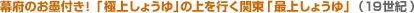 ところが、江戸も末期の元治元年(1864)、名実共に「地廻りしょうゆ」が「下りしょうゆ」の上に立つ出来事が起きます。この年、幕府はインフレを抑えるため、諸商人に現行の3〜4割の価格引き下げを厳命します。銚子と野田のしょうゆ醸造家は、「しょうゆは品質を落としたり、量をごまかしたりできないので、値を下げれば経営できなくなってしまう。」と申し立てたところ、幕府は「もっともだ!」として、「次のものは品質が特に優良なので“最上しょうゆ”として、特別に値下げをするに及ばず。」と、現行価格で販売することが許可されたのです。この恩恵に浴したのは、銚子のヤマサ、ヒゲタ、ヤマジュウ、ジガミサ、野田のキッコーマン、キハク、ジョウジュウの七銘柄だけでした。