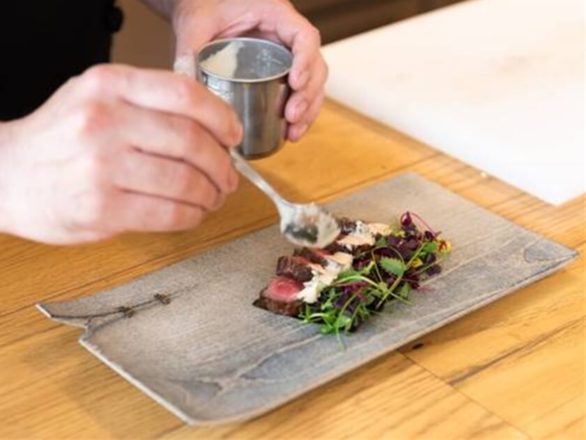 おいしく調理するためのポイントは、黒毛和牛・出汁・減塩醤油が三位一体となる「下味の付け方」です。昆布には減塩醤油を刷毛で丹念に塗りましょう。そうすることで牛肉を包んだ際に、昆布と減塩醤油の風味がしっかりと行きわたります。また、昆布にまぶす鰹節は丁寧に煎ることで香りとうま味に丸みが出ます。主役の牛肉は、出汁の繊細な風味と合わせることを考慮し、脂身が少ない赤身の部分を使うことをおすすめします。実際の調理では炭火で焼き上げましたが、ご家庭ではオーブンレンジで代用できます。「180℃で5分加熱→5分休ませる」という工程を2回繰り返してください。