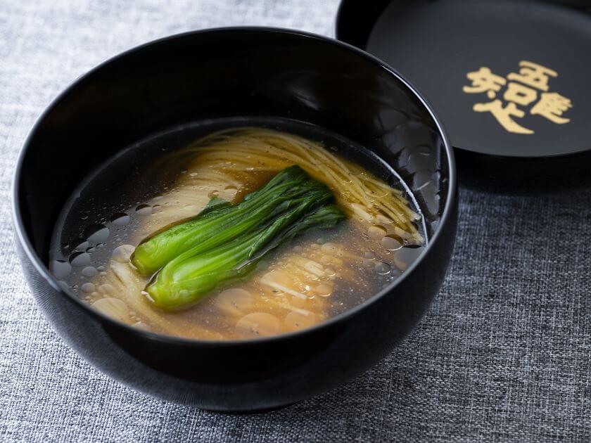 太白油と黒コショウ、「ヤマサ重ね仕込しょうゆ 本懐石」を入れた器に、出来上がったスープを注ぎ、ゆでた麺を入れて整え、青味を飾ります。今日はミニ青梗菜を使いました。味つけは醤油と、野菜から出る甘味だけ。魚の塩味で醤油の量は調整します。