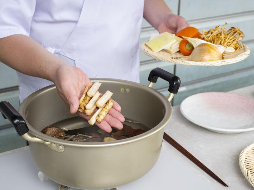 昆布を一番下に入れ、全ての食材とミネラルウォーター、純米酒を鍋に入れ、内臓を除いたいりこ、深い味わいを出す厚削や干ししいたけも加えます。鍋を火にかけ、沸いたらお湯が回るくらいの弱火にします。