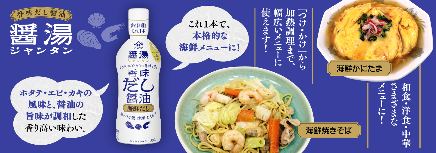 「ヤマサ 香味だし醤油 醤湯(ジャンタン) 海鮮だし」は、ホタテ・エビ・カキなどの旨味と醤油の旨味の調和がとれた、濃厚な海鮮だし醤油。中華や洋食との相性もよく、メニューの幅も広がります。「ヤマサ 香味...