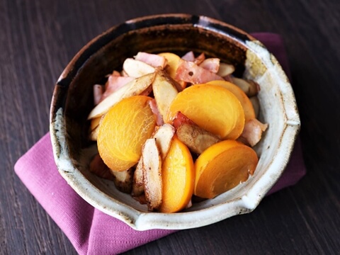フルーツだってきんぴらに!旬の柿の甘味にベーコンの塩味を合わせた洋風きんぴらです。