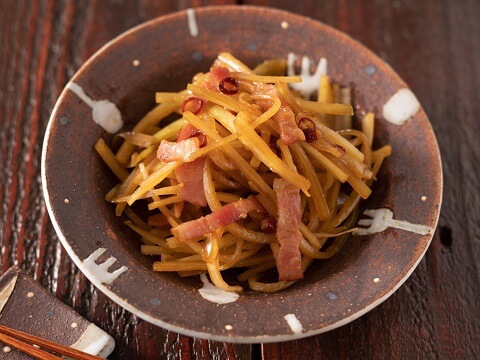 捨ててしまいがちな大根の皮を上手にリメイク!大根の皮はちょっと辛味が強いので、旨味の強いベーコンと合わせ、少し砂糖を加えるのがポイントです。