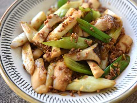 大きく切ったエリンギとねぎをが主役の炒め物。生姜やにんにく、ごま油の風味を活かして、「ヤマサ鮮度生活 特選丸大豆しょうゆ」で香りよく仕上げます。