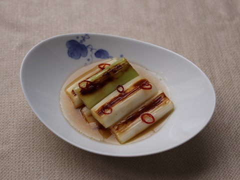フライパンでこんがりと焼き色をつけた長ねぎを「ヤマサ 絹しょうゆ減塩」ベースのマリネ液に一晩漬けます。シンプルながら、じわっと染みたしょうゆの風味が長ねぎとよく合う一品です。