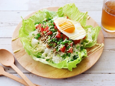 レタスの上に、ごはんと「たっぷりきのこのエスニックそぼろ」、目玉焼きを乗せたカフェ風丼スタイル。仕上げにマヨネーズをトッピングして、サラダごはん感覚で楽しめる一皿です。
