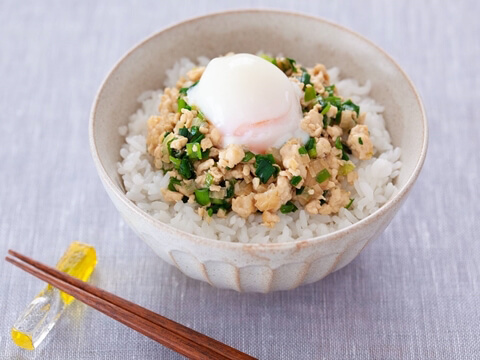 ほかほかごはんに「ねぎにら中華鶏そぼろ」と温泉卵を乗せるだけ♪とろ~りとした卵を絡めながらいただきます。