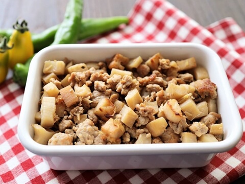 ■角切りれんこんとひき肉のバターしょうゆきんぴら(20分)