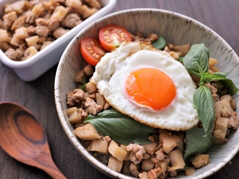 ■角切りれんこんとひき肉のきんぴらでガパオ風ライス(10分)