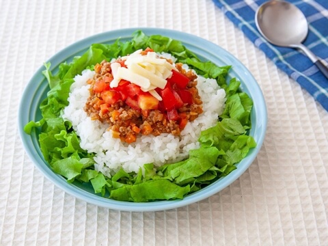 沖縄の人気ご当地メニュー「タコライス」風のアレンジ丼。野菜もたっぷりでヘルシーな一品です。