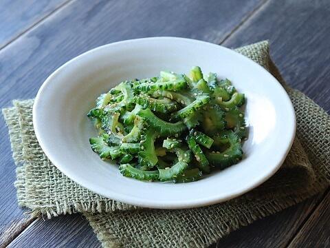 「ヤマサ ぱぱっとちゃんと これ!うま!!つゆ」とごま油で炒めて、ゴーヤの苦みを活かしたごはんがすすむ常備菜。