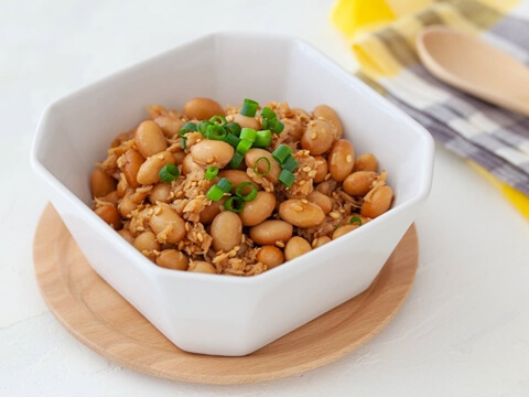 ツナ缶と大豆缶を「ヤマサ 絹しょうゆ減塩」と砂糖で煮るだけで完成!包丁もまな板も使わない簡単レシピです。