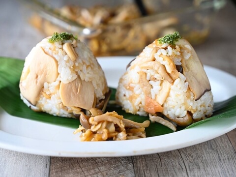 炊きたてご飯に「切り干し大根ときのこのレモンしょうゆマリネ」と梅干を混ぜ込んで、大きなおにぎりに!ランチやお弁当にぴったりです。