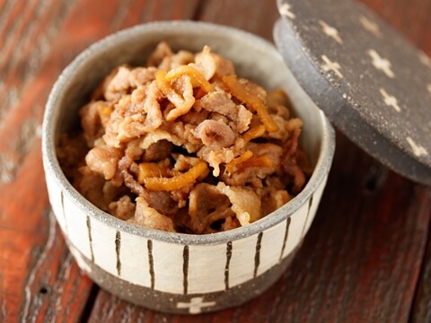 お財布に優しい豚こまを使ったご飯がすすむしぐれ煮。豚こまは「ヤマサ 絹しょうゆ減塩」ベースの調味料を揉み込んでおけば、劇的な柔らかさに!