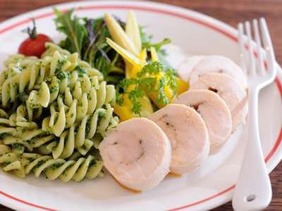 パスタソースは、パセリに「ヤマサ絹しょうゆ」、豆乳、オリーブオイルをミキサーで混ぜるだけ。ソースが絡みやすい、フリッジなどのショートパスタがおすすめです。