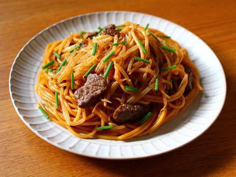 焼き肉用の牛肉を使い、もやしでかさまし!ボリュームも満点。「ヤマサ絹しょうゆ」にオイスターソースが隠し味の創作パスタ。