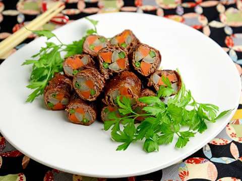 ごぼう、にんじん、いんげんを牛肉で巻き、フライパンで焼いてできあがり。 「ヤマサ 絹しょうゆ」とみりんの甘じょっぱい味わいが後ひくおいしさです。