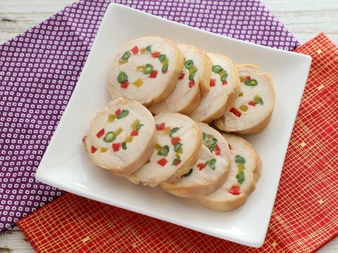 鶏むね肉にパプリカやいんげんなどの彩り野菜を巻き込み、ラップで包んで電子レンジにかけるだけ。豪華に見えるのに、お手軽調理がうれしい一品。