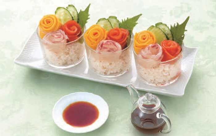 すし飯の上に、スモークサーモンや鯛、薄焼き卵の花をあしらったカラフルなカップ寿司。お刺身は鯛の他、マグロ、カツオなど、薄切りにしたものならバラの花を作ることができます。