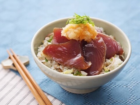 みょうがや大葉が香るさっぱりとした酢飯に、かつおの漬けを乗せたお手軽丼。かつおは「ヤマサ 絹しょうゆ」にちょっと砂糖を加えたタレで漬けるのがポイントです。