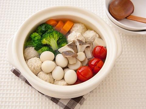 鶏つくね、 ミニトマト、うずら卵などひとくちサイズの具材を入れたかわいいおでん。味付けは「ヤマサ昆布つゆ 白だし」1本にお任せ!