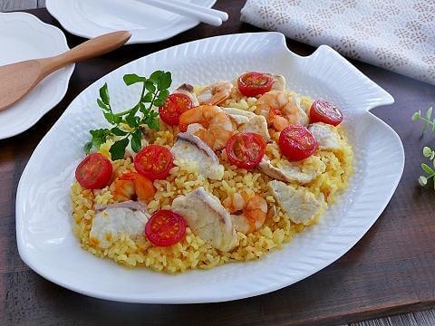 お祝いごとに欠かせない「鯛めし」をパエリア風にアレンジ♪鯛は刺身用のサクを使用しお手軽に。「ヤマサ昆布つゆ 白だし」とサフランで和洋風なおいしさに仕上がります。