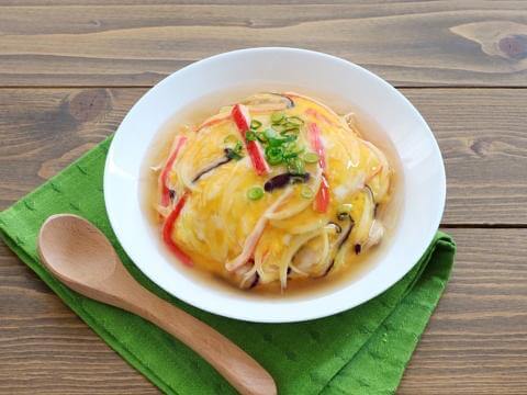 ふわとろ卵の食感がおいしい、絶品天津飯!「ヤマサ昆布つゆ 白だし」を使えば、だし取り不要で上品なあんを手軽に作れます。