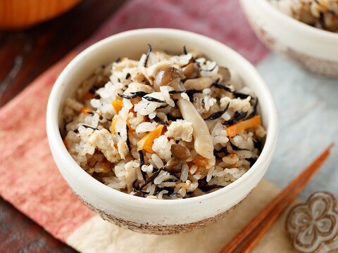 きのこやひじき入りで栄養満点、うま味もたっぷりの炊き込みごはん。「ヤマサ ぱぱっとちゃんと これ!うま!!つゆ」1本で、料亭の炊き込みご飯のような感動の味わいになります。