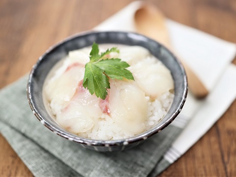 ぜひお試しいただきたい「鯛の昆布締め風」のアレンジレシピ。鯛のうま味にほんのり甘く、だしのきいたおつゆがベストマッチな鯛茶漬けです。