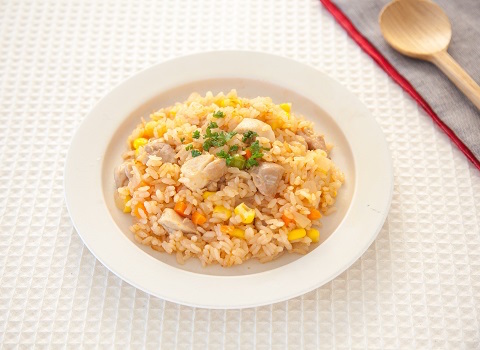 ケチャップと「ヤマサ ぱぱっとちゃんと これ!うま!!つゆ」を入れて炊飯器で炊くだけで手軽においしいチキンライスの完成!お子さんも喜ぶメニューです。仕上げに加えるバターが風味アップのポイント。