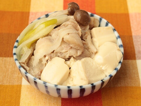 絹豆腐と豚肉、ねぎ、しめじで作る簡単肉豆腐。