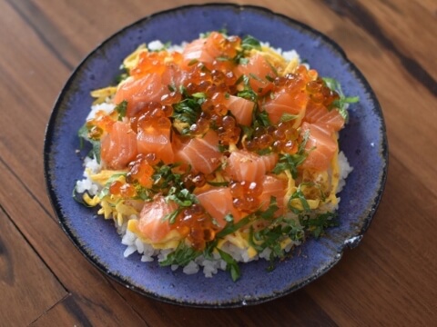 酢飯、錦糸卵、サーモンの味付けに「ヤマサ ぱぱっとちゃんと これ!うま!!つゆ」を使ったちらし寿司です。彩りも華やかで、お祝いにもぴったりです。