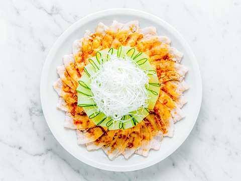ゆでた豚バラ肉を薄く切った様子が雲のように見えることが名前の由来の「雲白肉」を冷しゃぶ用の薄切り豚バラ肉で簡単に。コクがありながらもまろやかな風味の「ヤマサ 絹しょうゆ」ソースとフレッシュな味わいの「ヤマサ まる生ぽん酢」ソースの、2種の味わいで楽しむ一品です。