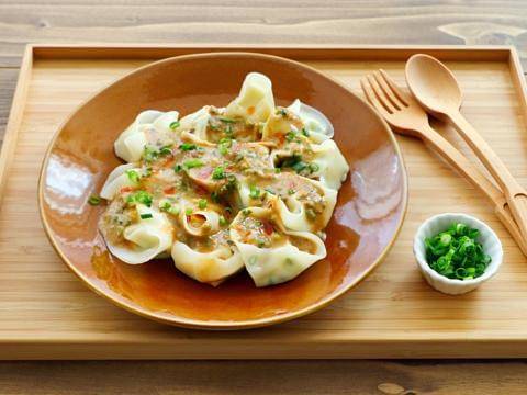 「ヤマサ まる生ぽん酢」がさわやかな、手作りの「よだれタレ」がポイント!豆腐メインの肉なしヘルシー水餃子に、よだれタレをたっぷり絡めていただきます。