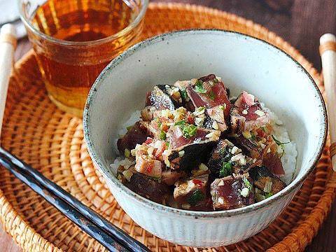 初がつおを使って香味たっぷりに仕上げた丼。フレッシュな風味の「ヤマサ まる生W(ダブル)おろしぽん酢」を使うことでかつおの臭みを抑え、おろしがはいっている分具材とも絡みやすくさっぱりといただけます。
