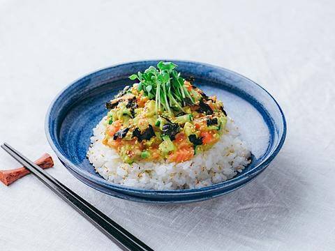 人気のカリフォルニアロールを丼仕立てに!サーモンときゅうり、そしてアボカドをタルタルにし、「ヤマサ まる生ぽん酢」 でさっぱりと味付けし、ごはんにのせます。