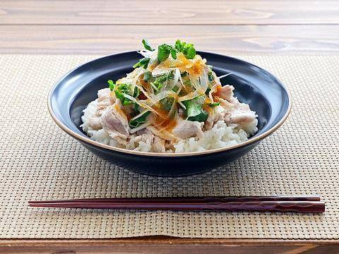 手軽なサラダチキンを使った、おしゃれなヘルシー丼。火いらずで大満足の食べごたえ。「ヤマサ まる生ぽん酢」とマヨネーズに、しょうがとごまの風味を効かせたタレがポイント♪