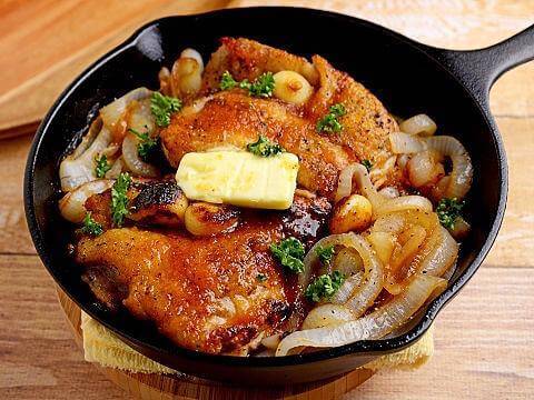 ■チキン&オニオン&ガーリックのスキレット焼き まる生Wおろしぽん酢がけ