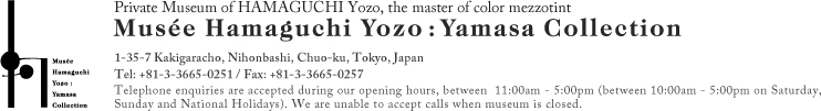 浜口陽三は、1909年にヤマサ醤油株式会社の先々代の社長、濱口儀兵衛の三男として和歌山県に生まれました。生家は、1645年以来お醤油造りを続けてきましたが、陽三は家業を離れて東京美術学校(現東京藝術大学)の彫塑科に入学しました。1930年には大学を中退してパリに渡り、油彩、水彩、銅版画など幅広い創作活動を行います。第二次世界大戦により帰国し、戦後の1948年頃から本格的に銅版画の制作を始めます。