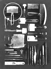 Tools of HAMAGUCHI Yozo for making mezzotint prints. The work gloves and woolen covers for protecting the important tips of the tools.