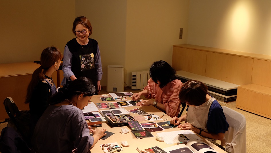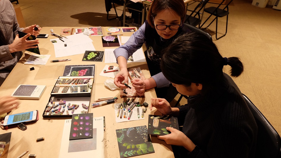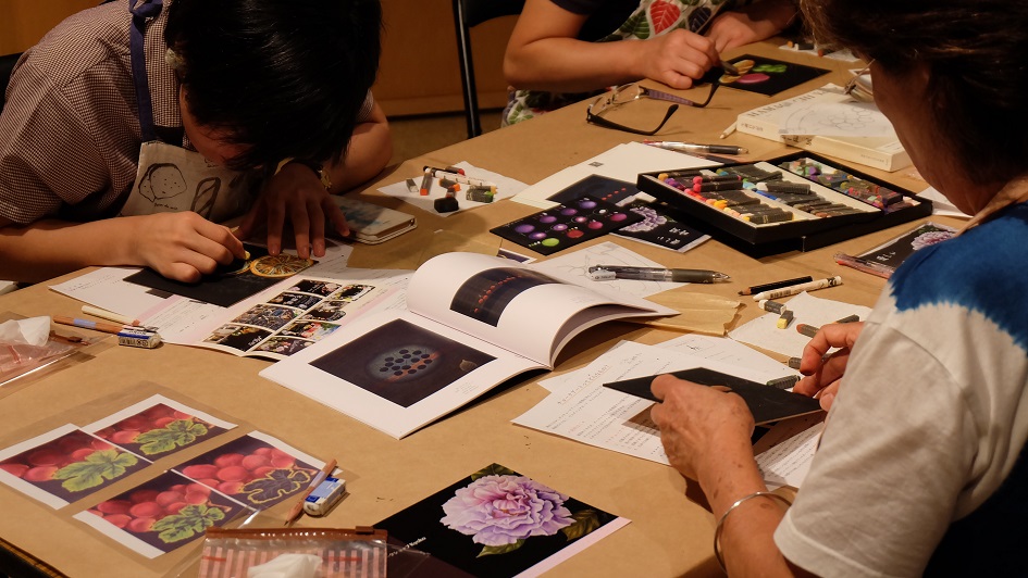 この秋の休館中、浜口陽三作品に響くイベントの時間を設けました。そのひとつとして10月12日(金)に「黒に描くたべもの(チョークアート・ワークショップ)」を開催いたしました。講師には比企京子先生をお迎えしました。