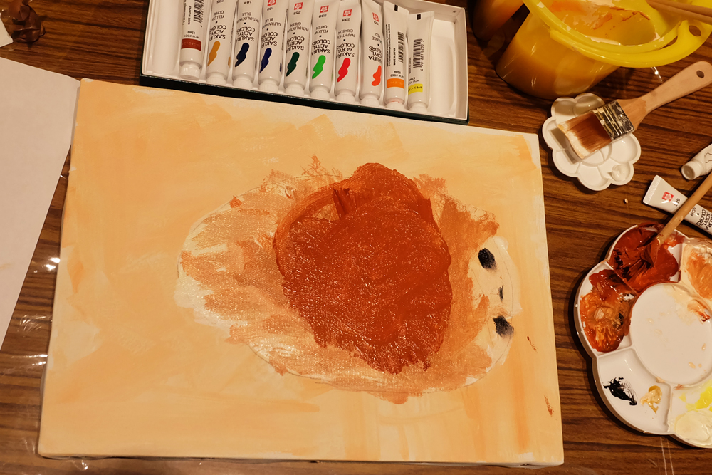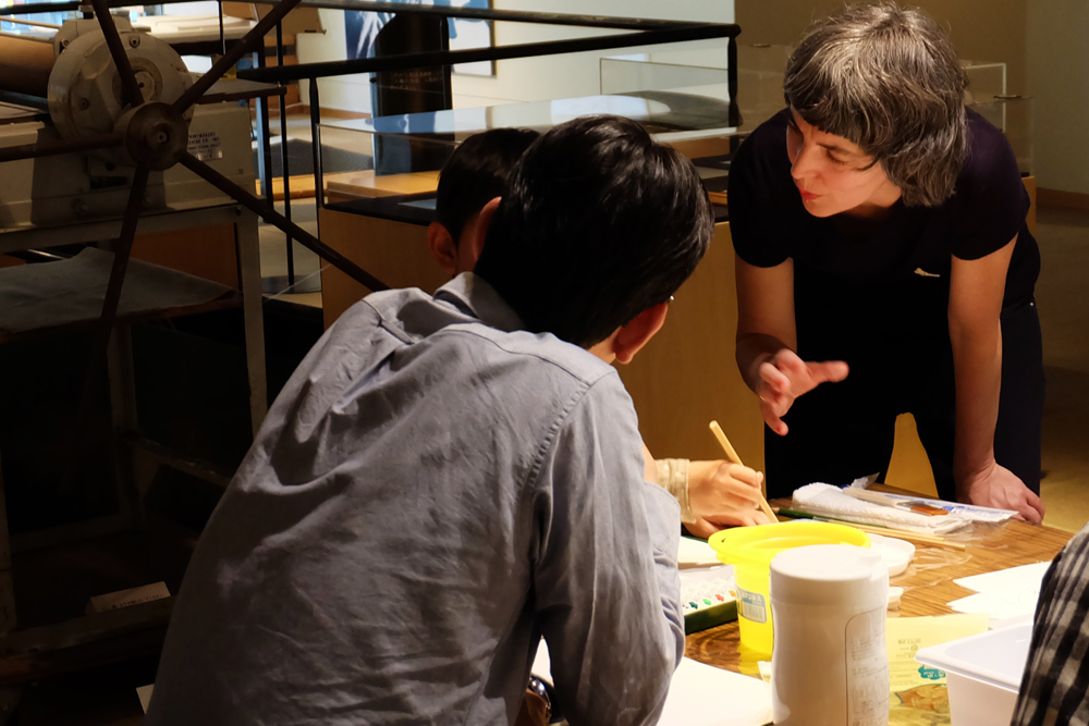 「まず背景の色を決めましょう」。カロリーナ氏と一緒に色や、色の混ぜ方を考えます。 |