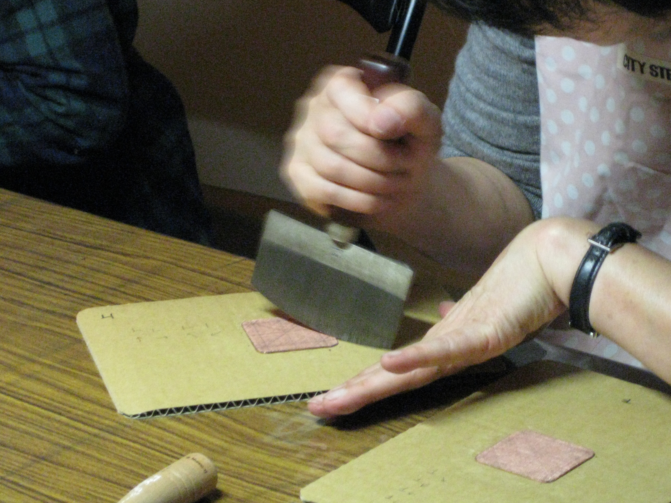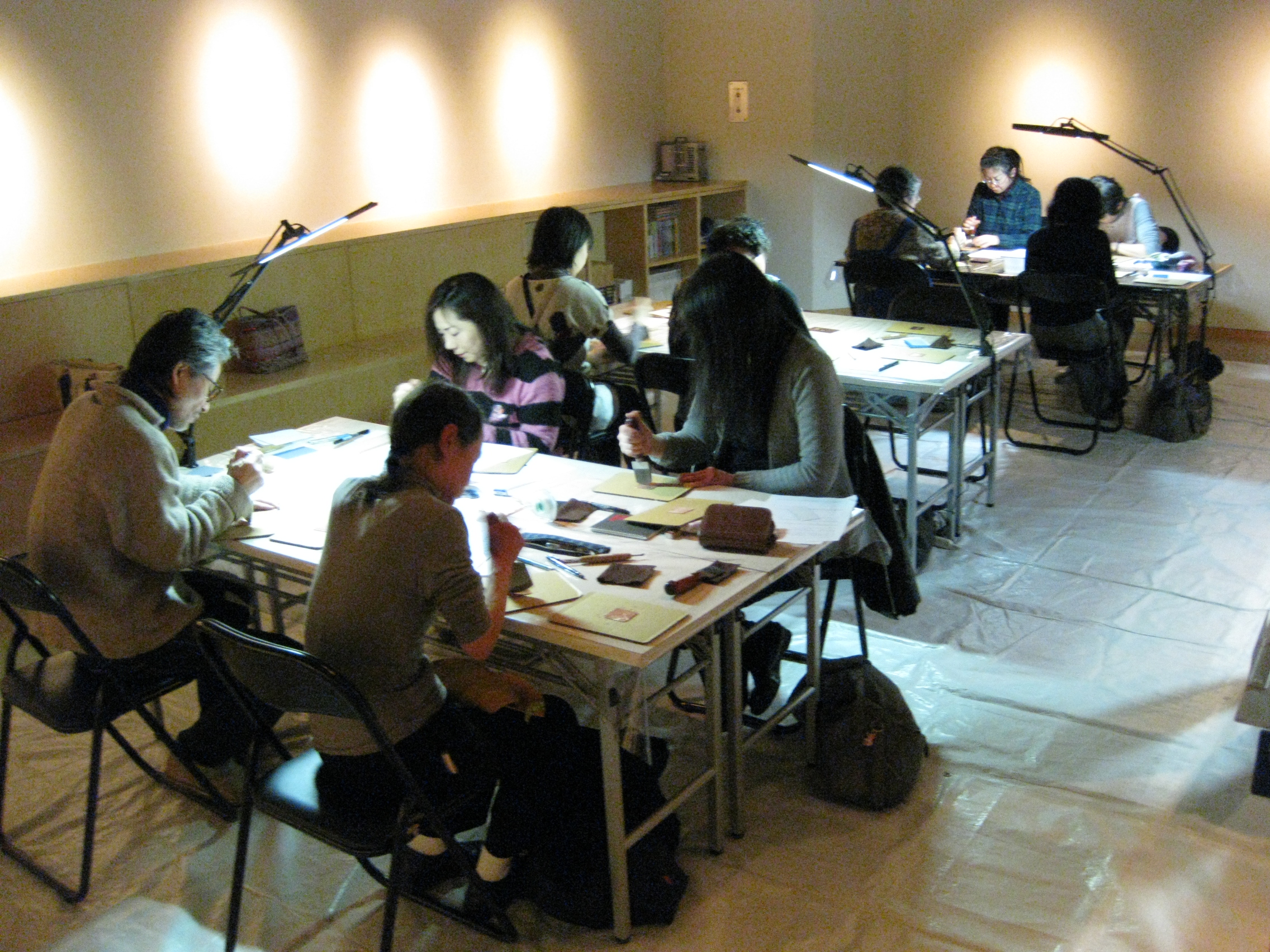 もくもくと目立てをする参加者のみなさん。つるつるだった銅の表面が、だんだんとざらざらとした手触りに変わっていきます。製版後のインク詰め、刷りも参加者自身で行います。 |