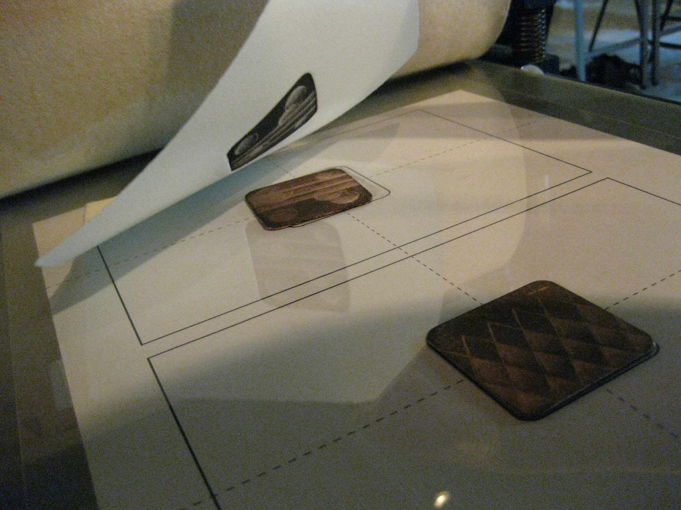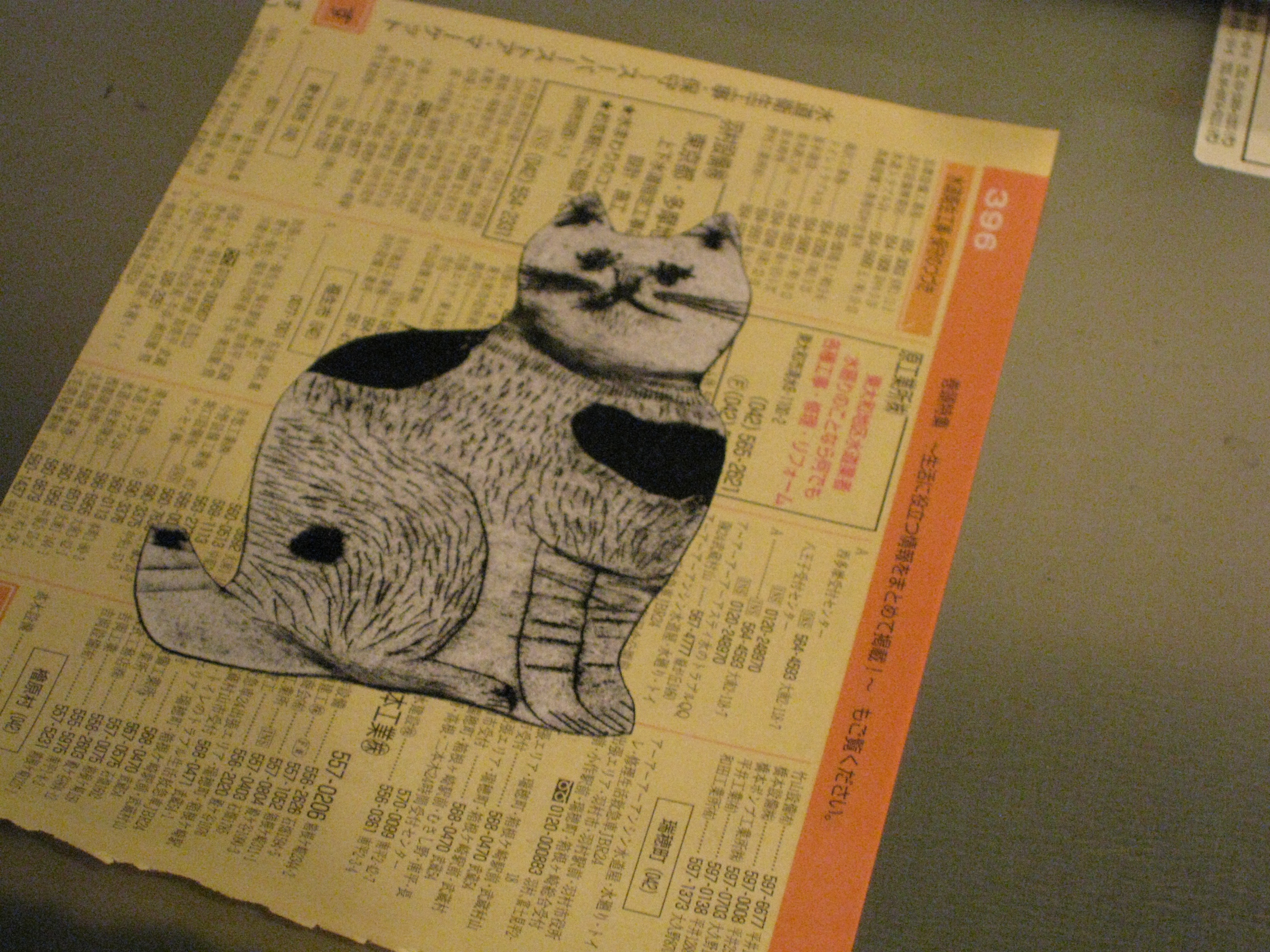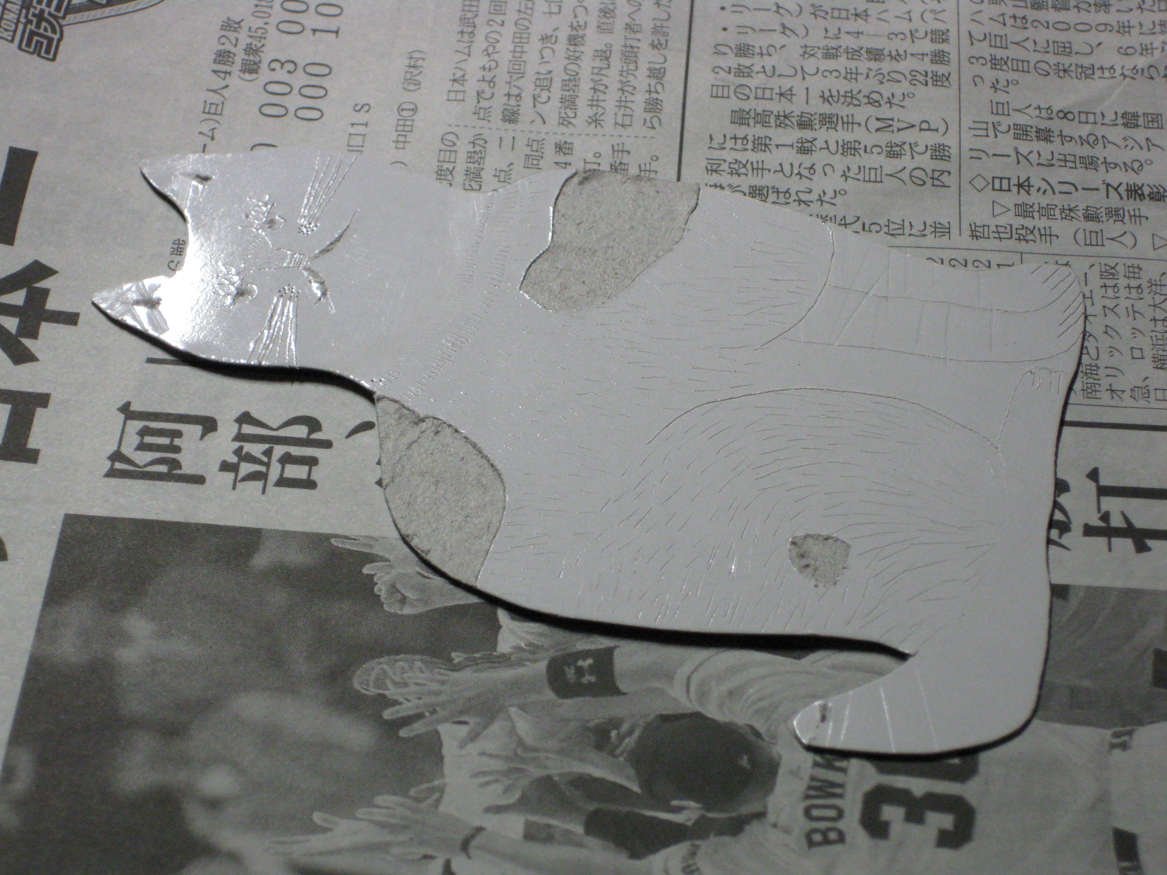 つやのある面に傷をつけたり、破ったり。紙なので柔らかく、とても加工がしやすいです。こちらは先生が事前に用意してくださったネコ形の版。 |