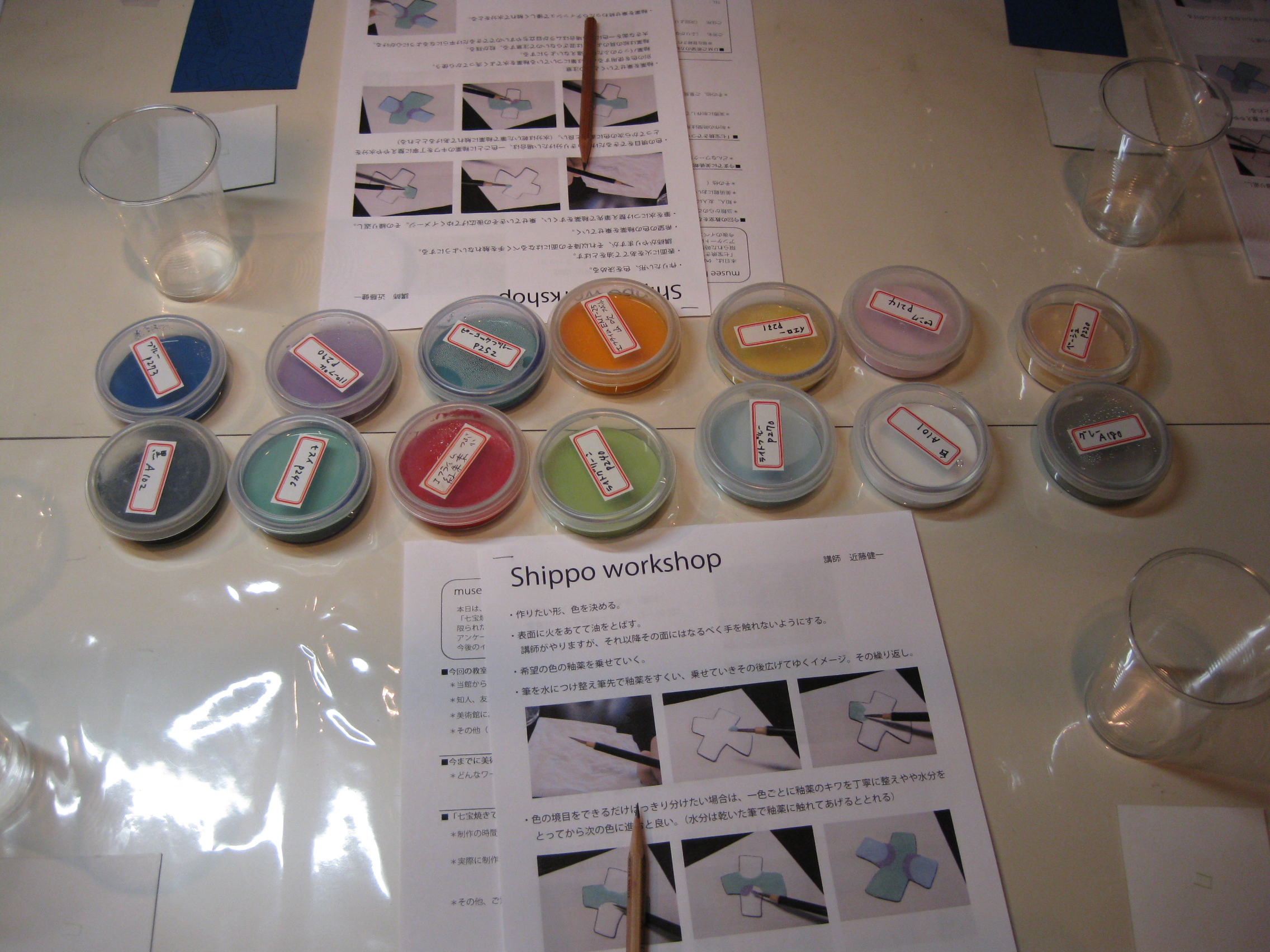 色とりどりの釉薬(粉状のガラス)が並んでいるところ。 |