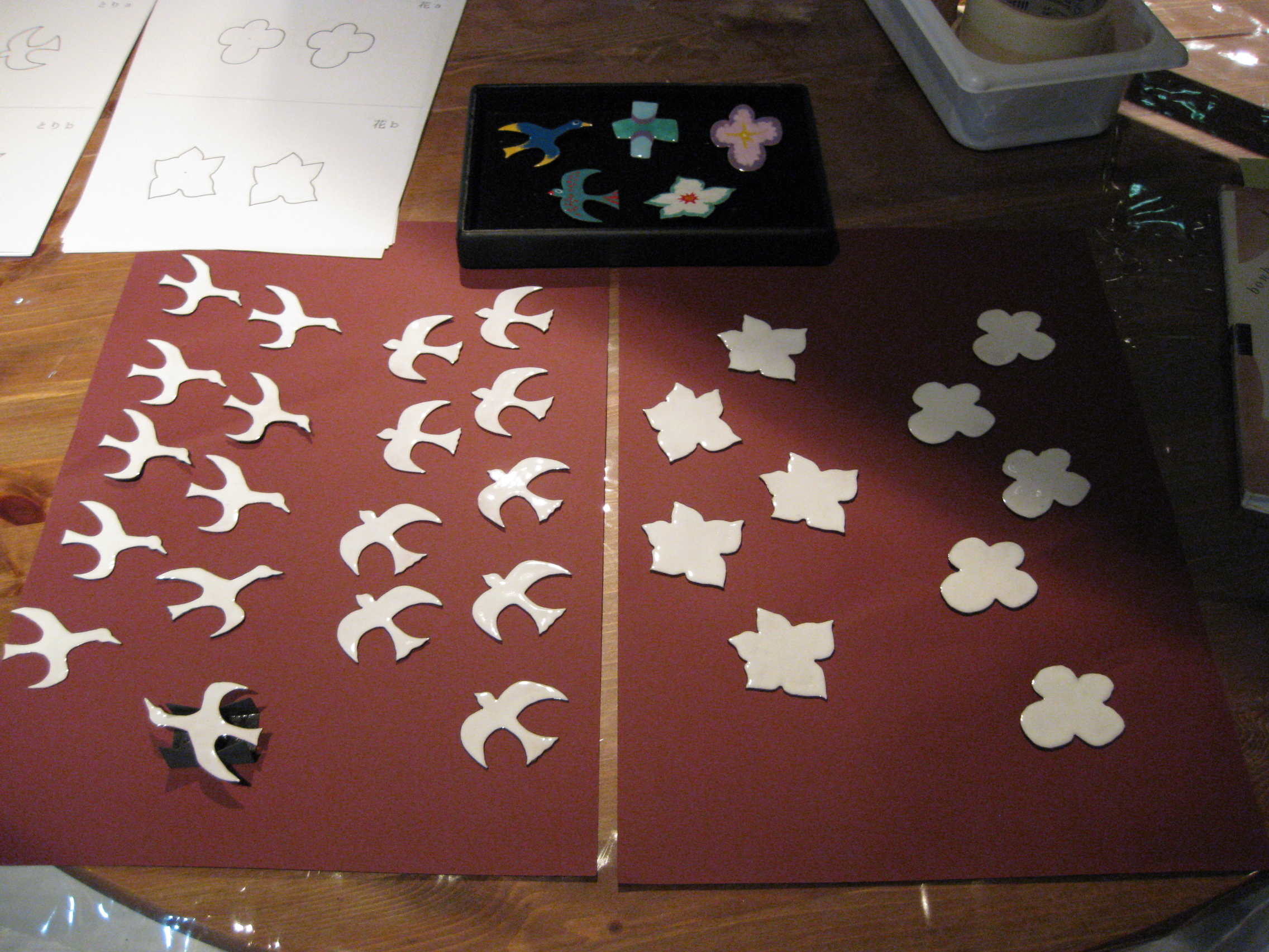 南桂子作品の中から、講師の近藤健一先生に、花と鳥の形を2種類づつ選んでブローチの土台部分を作っていただきました。予め切り取った銅板に下地の白い釉薬が焼きつけてあります。 |
